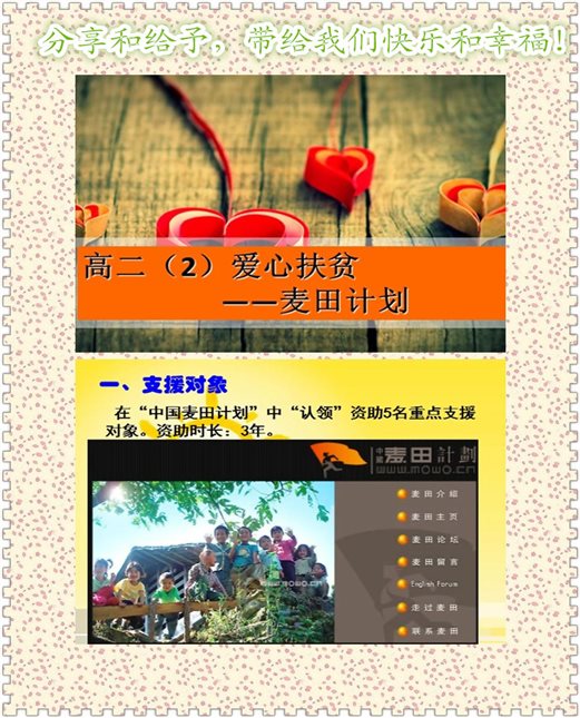 在刚结束的假期里,尚德高中部高二年级的学生们走进了“中国麦田计划”,首个民间扶贫组织,同学们积极踊跃的参与扶贫方案的设计以及实施过程,并为此专门制作了宣传影片,从帮助对象的选取,活动经费的来源,活动方式的展开,以及活动结果的反馈几个方面做了介绍。尤其是活动经费的来源很鼓舞人心,高二年级的学生们打算压用压岁钱,打车钱,买饮料的钱来支援贫困地区的孩子们,并且在网络大环境下,利用微博和微信平台发动社会各界爱心人士捐款,通过这样的活动,充分体现了学生们淳朴的品质和助人为乐的精神,受人玫瑰手有余香,让我们的学生将帮助别人和善良品质传承下去!将爱心传递下去!行动起来吧!