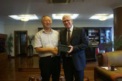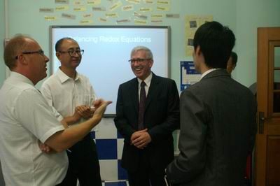 4 日下午,在校领导的陪同下,英国贵宾一行饶有兴趣地参观了学校的所有教学设施,并认真询问了学校在环境布置、课程设置、学生管理、办学特色等方面的理念。对尚德办学环境赞不绝口。随后,贵宾一行与姜晓勇校长进行会晤。两位教育大师亲切交谈,就很多共同的教育话题深入探讨,甚感相见恨晚。
