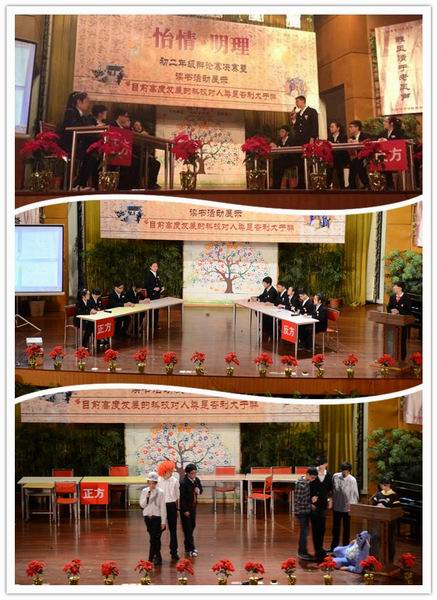 总决赛的辩题是“目前高速发展的科技对于人类是否利大于弊”,正方初二7-10班,指导老师是语文组张朝鑫,张迩天老师,反方初二1-5班,由政治组张希乐和韩善华老师挂帅。