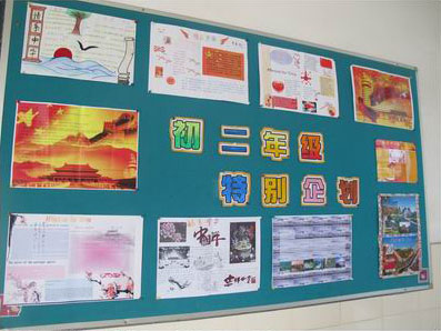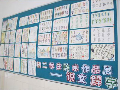 两块在 E1 , E2 大厅的年级展示板在学生自主管理委员会宣传部长的安排和设计下,每 2-4 周更新一次,如暑假特别企划展示、“说文解字”初二象形文字创作展示、英语美文小报展示、年级优秀爱国主题小报展示、“弟子规”硬笔书法展示等。每次看到有学生和老师在展示板前驻足观看,我们更坚定了利用好这无声的宣传阵地,使更多的学生作品有展示的机会。