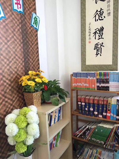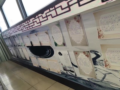 四年级的主题是“ ”。走廊板面分为三个板块:传统文化展示,好书悦读,遇见更好的自己。学生们动手制作好书推荐卡,通过立体的封面展示及推荐理由,为学生们提供了一次分享好书的机会。同时,每个班级都建立了图书角,不少于100本的图书及好书共读制度,为学生搭建了一个悦读好书的平台。学生们通过“星语星愿”的方式写下了各自的梦想,让每一个美好的梦想在尚德放飞。皮影、风筝、书法、茶、……一条长长的走廊呈现出浓浓的中国风,犹如穿越了一道历史的长河。郁郁葱葱的绿色植物装点过的窗台,营造出大自然的清新怡然。