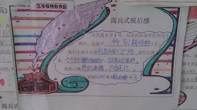2015年9月3日,世界聚焦中国,中国聚焦天安门广场,天安门广场举行了纪念中国人民抗战暨世界暨世界反法西斯战争胜利70周年阅兵式。尚德实验学校小学部号召全体学生在家收看这一历史盛况,并鼓励学生们拍下向祖国敬礼的照片,并及时记录观后感。