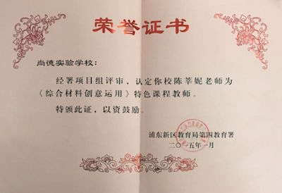 在2015的新学期,尚德实验学校美术组收到了让人振奋的消息,陈莘妮老师获得了浦东新区第四教育署《综合材料创意运用》特色课程教师。获奖是一种荣誉,一种至高无上的精神奖励,比起物质更让获奖者怀有激动澎湃的心。2014年的夏天,在编写综合材料教材的7天里,不管是汗水也好,欢乐也罢,都是不曾想去磨灭的美好记忆。再多的汗水再多的苦都已换回今日的荣耀,过程是参与者自己体会和感受的,别人看不到;但是,结果却是大家有目共睹的,这是美术组的成功和闪光。