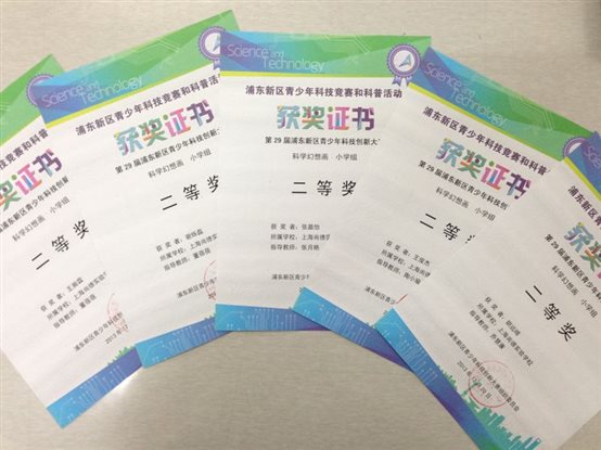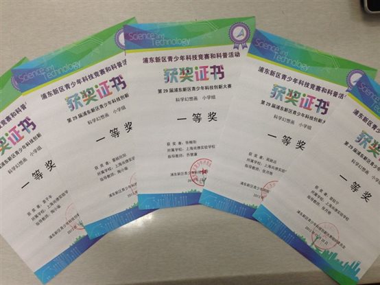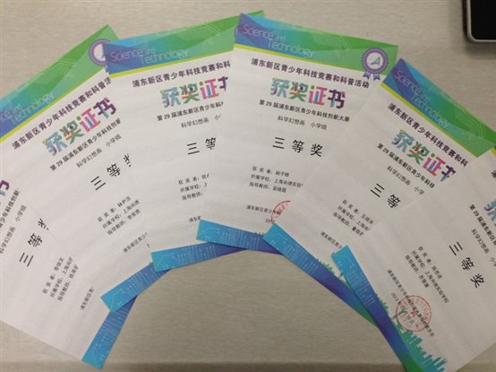 通讯稿 2014-05-28 2014年5月,我校小学部美术学科组织小学生参加第29届浦东新区青少年科技创新大赛,获得了丰硕的成果。学科主任张老师带领美术组的各位老师们倾力辅导,最终参赛的学生们一共取得了五名一等奖,五名二等奖,六名三等奖的优异成绩,让我们为得奖的孩子们喝彩!