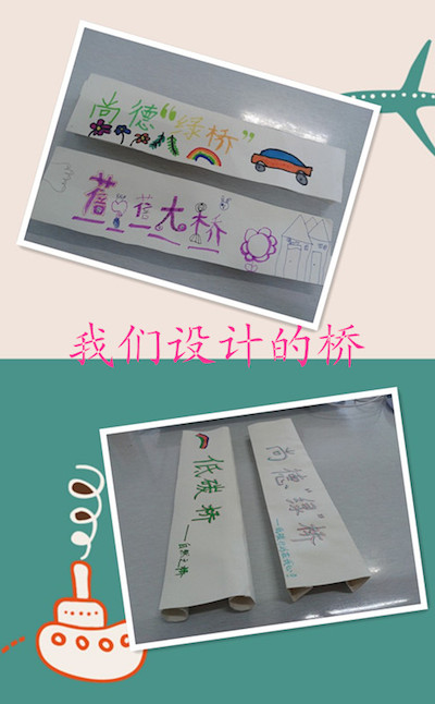 多姿多彩的桥 2014-05-21 桥有悠久的历史,见证了人类的聪明才智。本周,同学们在了解了拱式桥、梁式桥、悬索桥后,为桥的多姿多彩所惊叹。大家从最基础的梁式桥开始,搭建了纸桥,看哪种形状的纸桥承重本领最强。 大家动起小手,分别搭建了承重结构为三角体、正方体、圆柱体的纸桥。通过比较,三角体的桥梁承重本领最强。孩子们对桥梁的设计产生了浓厚的兴趣,立志长大成为一个个优秀的桥梁设计师。