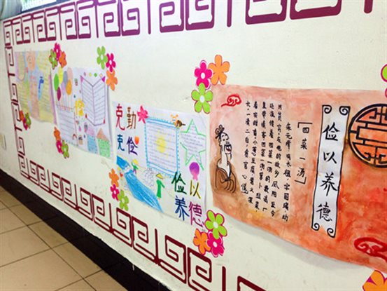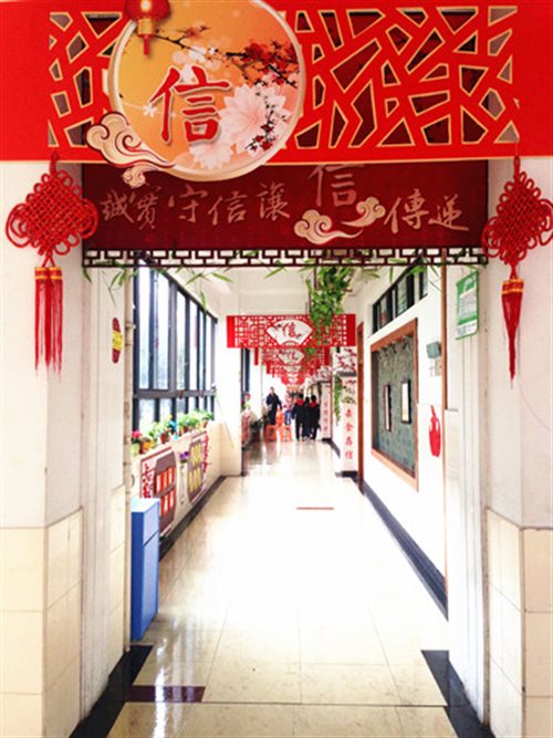 “诚实、守信,让信传递”——古韵悠扬的书香将我们带到了三年级。中国风的剪纸,中国红的窗棂,给中华民族传统美德——“诚信”披上了古色古香的霓裳。走廊犹如秀美的苏州园林,教室宛如精致的亭台楼阁,“诚信”成语,“诚信”故事点缀其间,意蕴悠长。
