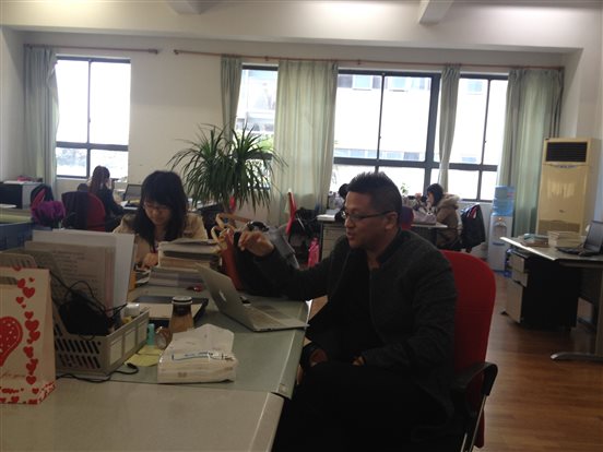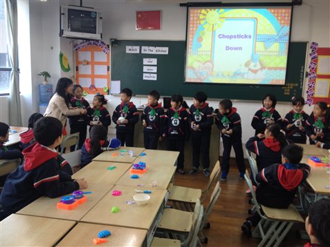 这节课注重生活,主题是厨房。谈老师把自己变身为魔术师,让学生们猜袋子里的用具,一个个引出厨房的用具。充分的课前准备,谈老师准备了七套厨房用具,让学生们的口语操练更真切。谈老师让六个学生为一个小组,上课模式新颖,围坐在一起,运用sing、chant、game等活动设计,教学内容得到了充分的体现。看!下面就是谈老师正在与学生们互动: