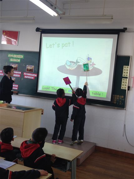 第三节课时,新教师刑云在二(10)班也上了M3U3 In the kitchen,虽然和谈老师是同一个课,但是他们同课异构,凸显了各自的优点。刑老师上课非常的干练,教学流程非常清晰,以一只淘气的猫引出主题kitchen,故事教学运用的自如妥当,游戏“使用拍苍蝇”的设计,学生们积极举手,兴趣盎然。看,两位学生正在讲台前玩游戏,单词和句型都得到充分的运用。