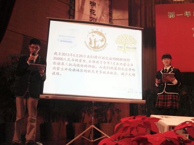 “尚德林”百万植树计划是国际部于2009年年与“根与芽”组织开始的合作项目,其宗旨是为了培养学生的环保意识,为社会造福。今年国际部计划完成25000元的筹款任务。启动仪式全程由学生策划、组织,活动当天不仅有国际部姚校长亲自参与,同时还邀请到了DP家委会会长陶伟华女士亲临。学生去内蒙古植树的视频、PYP小朋友的精彩演出、张烨瑞同学精彩而震撼的演讲,把活动一次一次推向高潮。