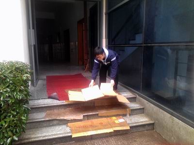 无独有偶,孩子们也想到了这一处。国际部12B的李燕玲同学也在一大早主动自发地为同学们必经的科技楼通道铺上了硬板纸,在纸板被积雪浸烂后又重新铺上新的一层。