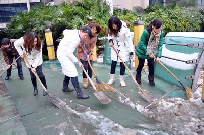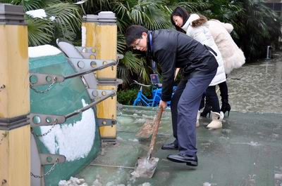 开学日大雪丰美 众师生铲雪通行