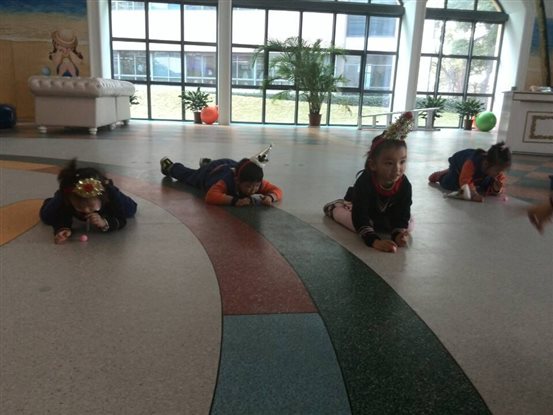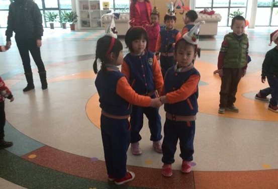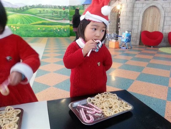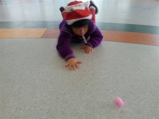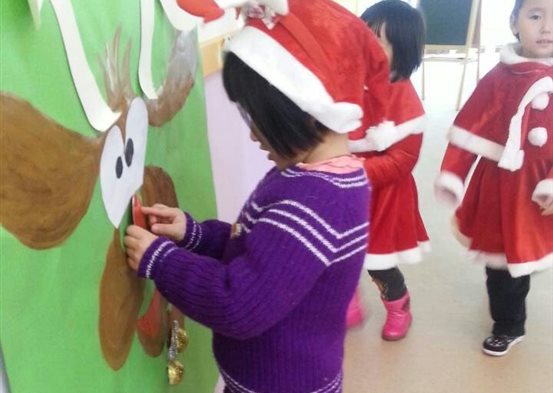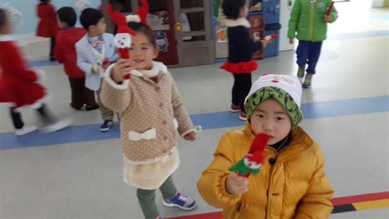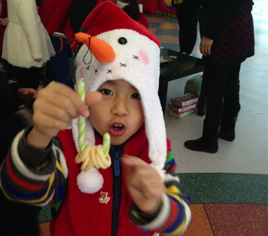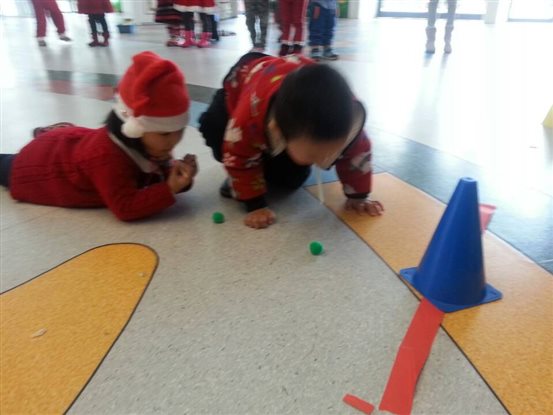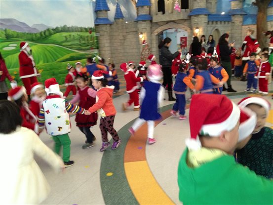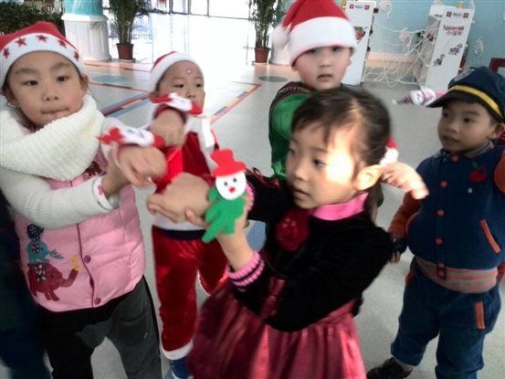 我们的第一个活动就是“木头人不许动”,大厅里播放着“Jingle Bells”和“We Wish You A Merry Christmas”这两首圣诞歌曲,小朋友们可以伴随着音乐随意做动作,等音乐一停小朋友们就得马上静止得像木头人一样,谁的反应最快站着不动就可以得到圣诞老人发的小贴纸噢!