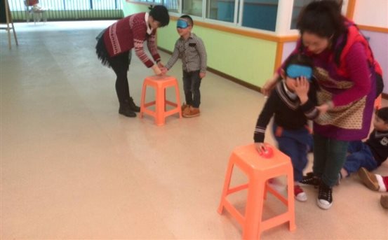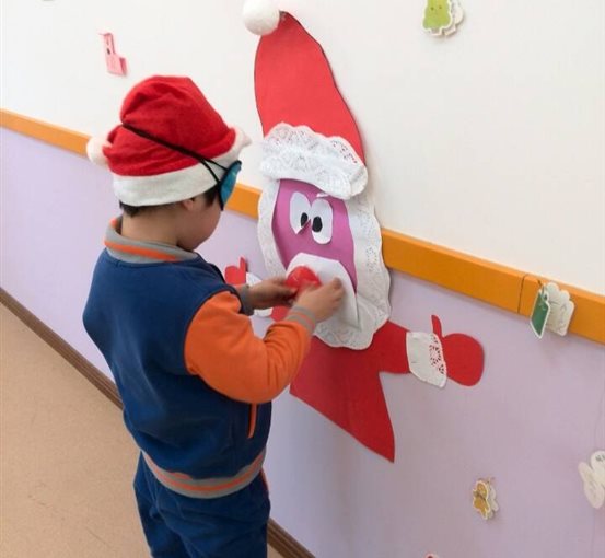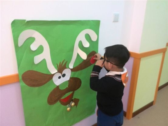 在这个游戏中,小朋友们必须戴上眼罩,沿着椅子转三圈后给墙上的驯鹿和圣诞老人贴上鼻子,看看谁贴得最准噢。戴上眼罩之后小朋友们都看不见,只能凭借自己的“第六感”和其他小朋友的提示。贴上之后,摘下眼罩看看是不是把鼻子贴对地方了呢?