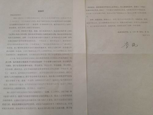 您好!我是五 ( 十 ) 班张思源的家长。孩子自从来到尚德学校已是第五个年头了,看着孩子一天天的成长与变化,我这个做母亲的心里对老师有说不出的感激。尤为感激的是他的班主任——顾老师。作为他的班主任,她不仅在学习上为孩子授业解惑,更在思想上对孩子谆谆教导。