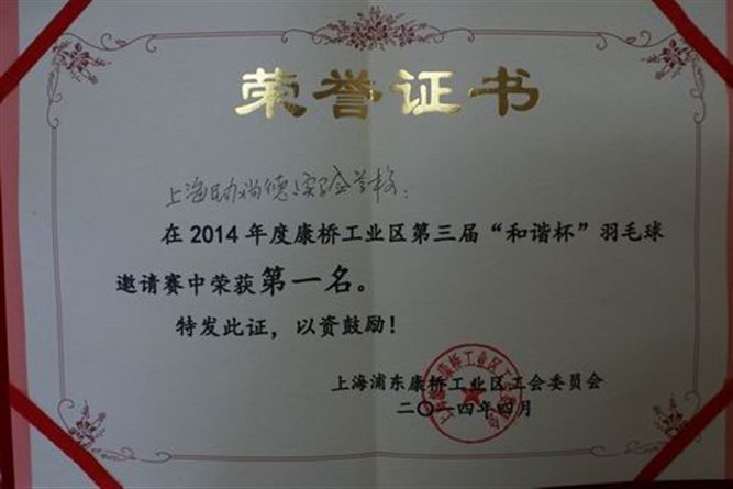上海尚德实验学校教职工羽毛球队勇创佳绩 2015-10-10 上海尚德实验学校教职工羽毛球队在2014年康桥工业区第三届“和谐杯”羽毛球邀请赛中荣获第一名。特此祝贺! 上海尚德实验学校 工会委员会 2014.4.28